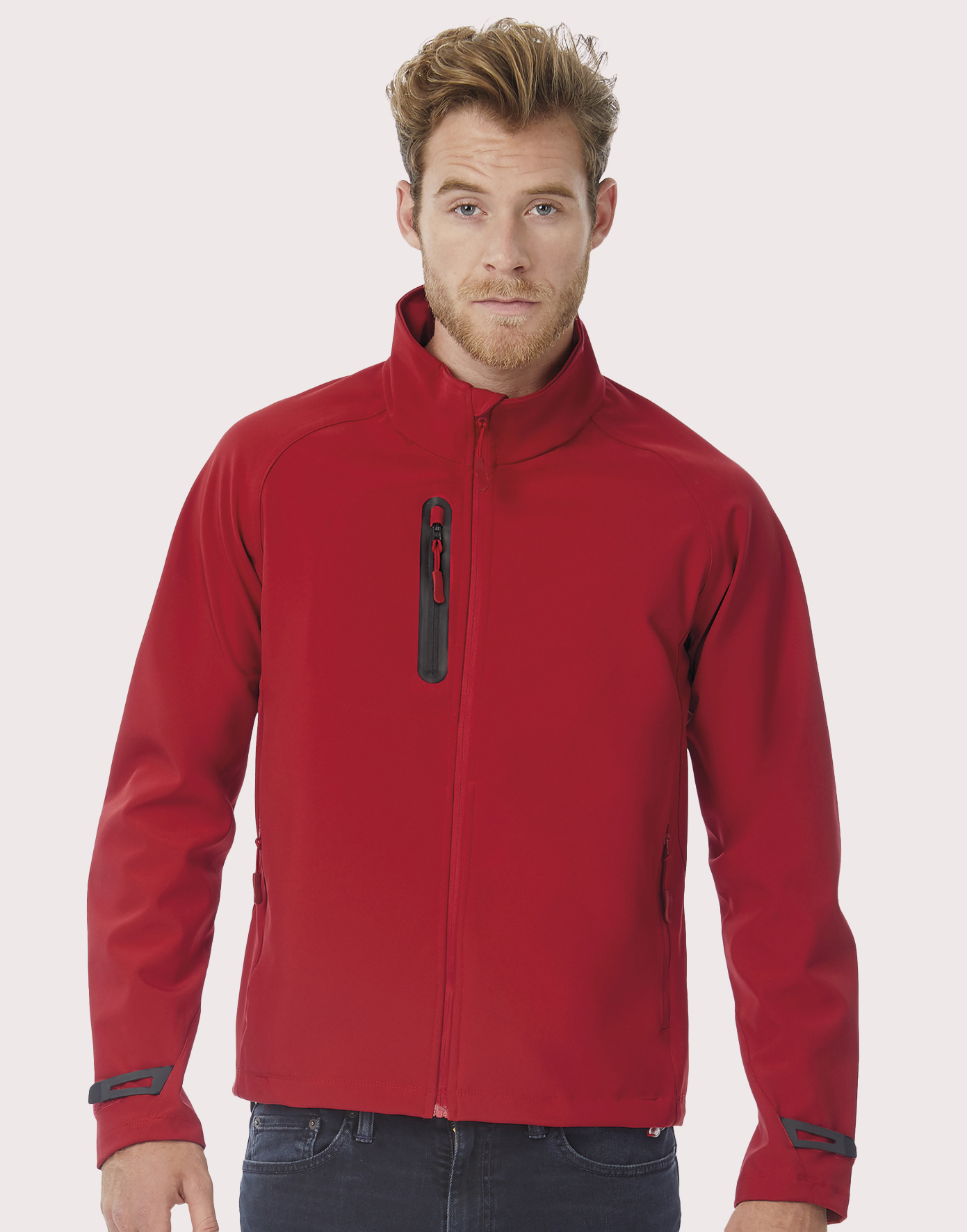 300 g/m² buitenlaag: 94% polyester, 6% elastan middelste laag; ademend materiaal voering: 100% polyester gaatjesstof ademend (tot 5.000 g/m² in 24h) en waterafstotende drielaags softshell stof koptelefoon lussen aan binnenkant kraag lange ritssluiting met kinbescherming borstzak met opening voor koptelefoon en rits twee zijzakken met rits opening voor kop telefoon bij rechterzak twee binnenzakken verstelbare klittenband mouweind onderboord met elastische koordjes en stoppers getailleerd model.