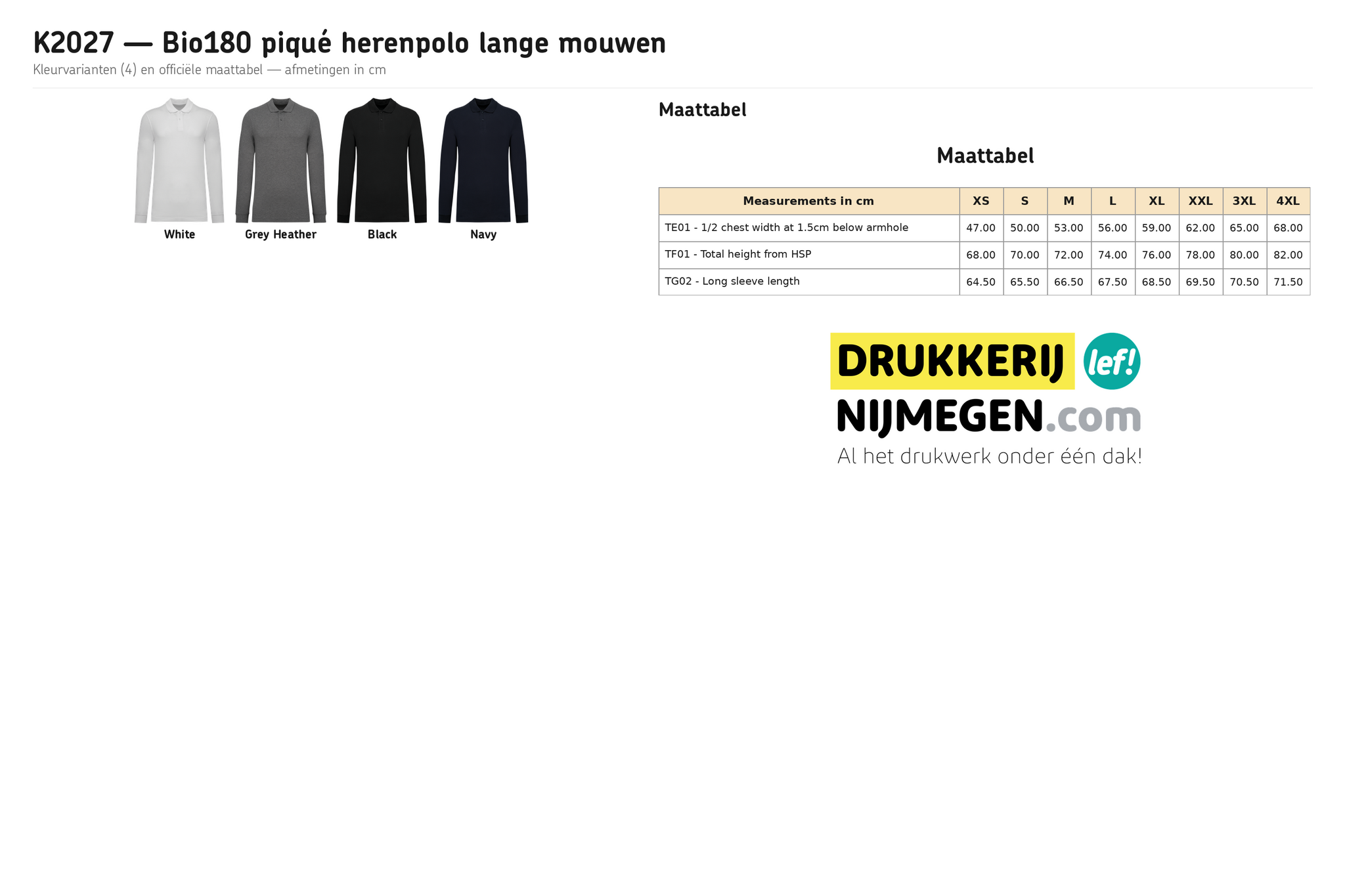 Polo bedrukken Nijmegen? Kariban K2027 Bio180 piqué herenpolo lange mouwen. 100% biologisch gekamd katoen (180 g/m²), piquétricot. GOTS, OEKO-TEX® & PETA Vegan gecertificeerd. 4 kleuren, maten XS t/m 4XL. Ideaal als bedrijfskleding met logo.