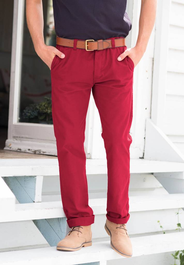 97% katoen / 3% elasthan. Chino pantalon met schuine zakken en 2 achterzakken. Riemlussen. YKK ritssluiting. Zonder naden. Zonder label ter vereenvoudiging van de personalisatie.