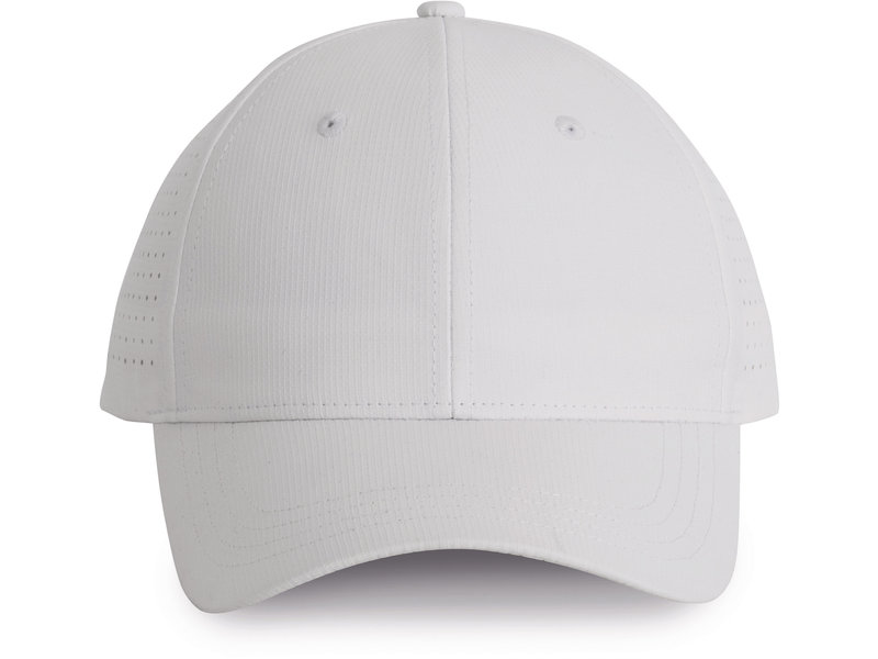 100% polyester. Pet met 6 panelen van polyester. De 4 achterste panelen kregen gelaserde microgaatjes om een optimale ventilatie te verzekeren. De zonneklep is afgerond. Deze pet kreeg een regelbare sluiting met klittenband.