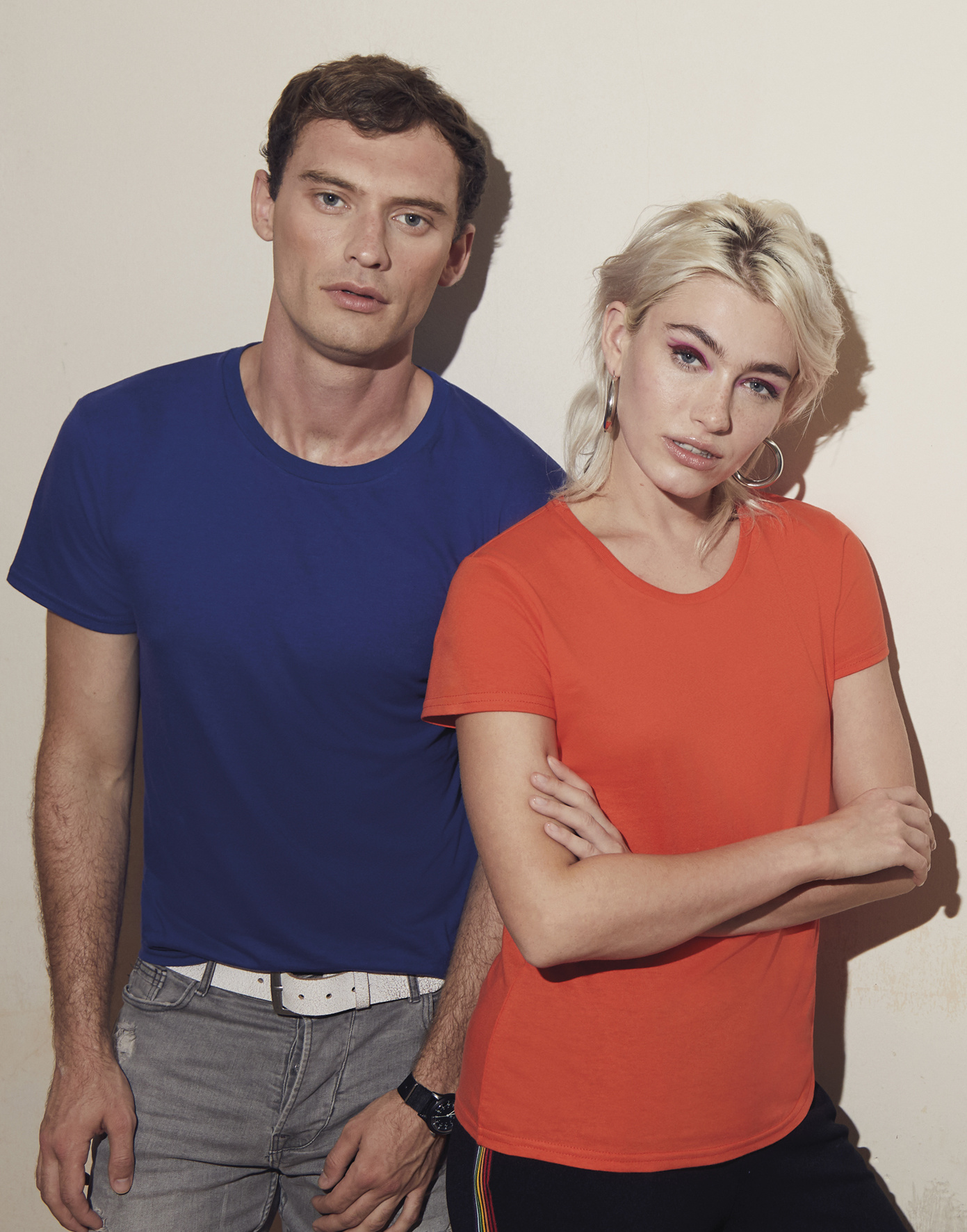 150 g/m² (Wit: 145 g/m²) 100% katoen, gekamd en ringgesponnen Heather Grey: 97% katoen, 3% polyester Andere Heather-kleuren: 52% katoen, 48% polyester Zacht aanvoelend Ronde hals met ribkraag Nekband Afscheurbaar etiket Ingezette mouwen Rondgebreid Getailleerd model