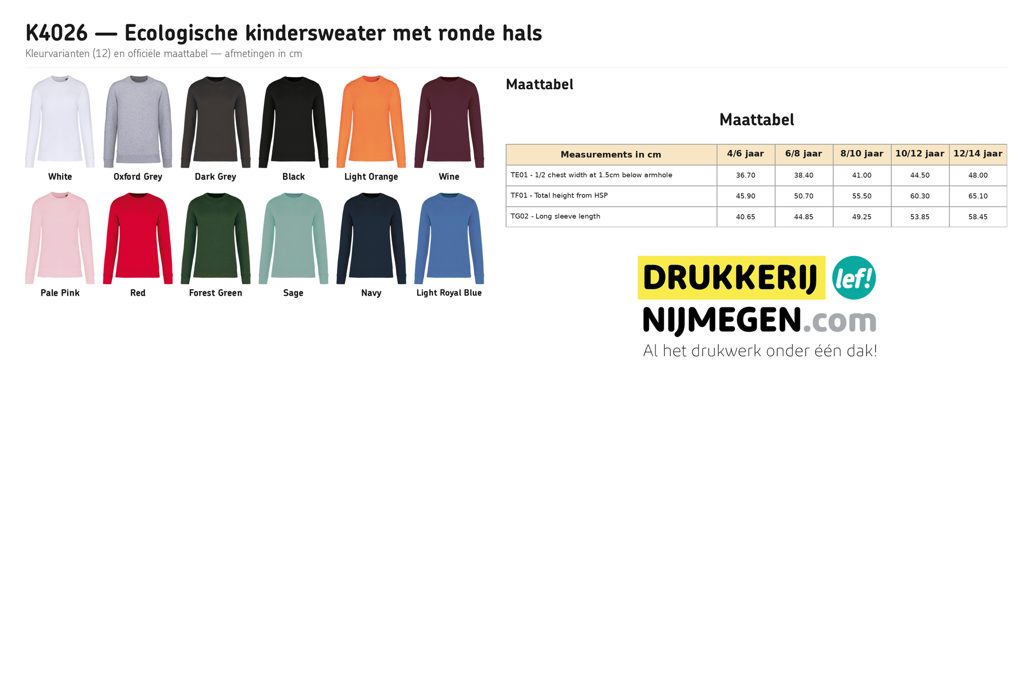 Kindersweater bedrukken in Nijmegen? Kariban K4026 ecologische sweater: 85% biologisch katoen, 15% gerecycled polyester (280 g/m²). GOTS, OEKO-TEX® & PETA Vegan. Maat 4/6-12/14 jaar, 12 kleuren. Ideaal als teamkleding met logo voor scholen en clubs.