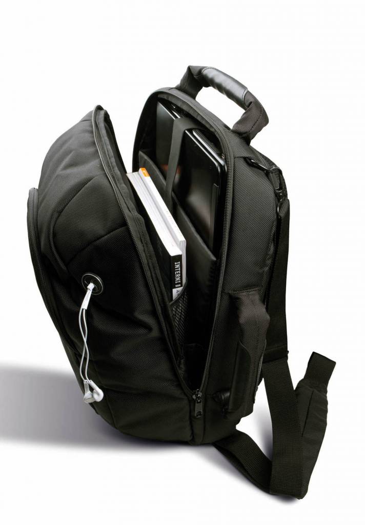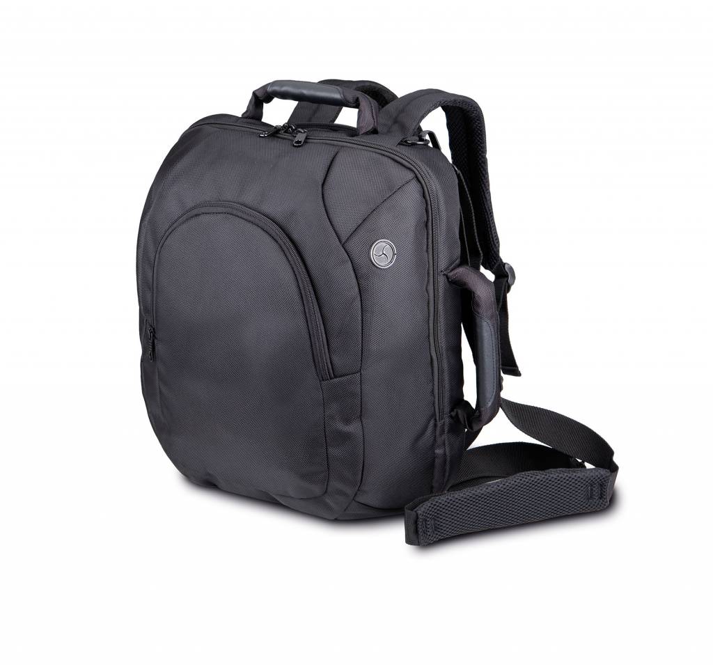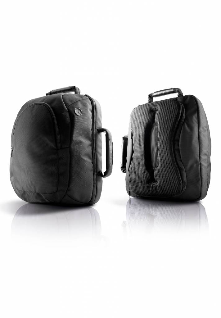 Double use computer / document bag convertible in a backpack in 1680D PU backing, hidden shoulder straps, padded mesh back, bottom zip to hang the trolley system, detachable and adjustable shoulder strap with shoulder pad, double reinforced padded handle, front organized pocket, main compartment fully padded for laptop (15") and documents, headphone hole, key holder. SBS zips.