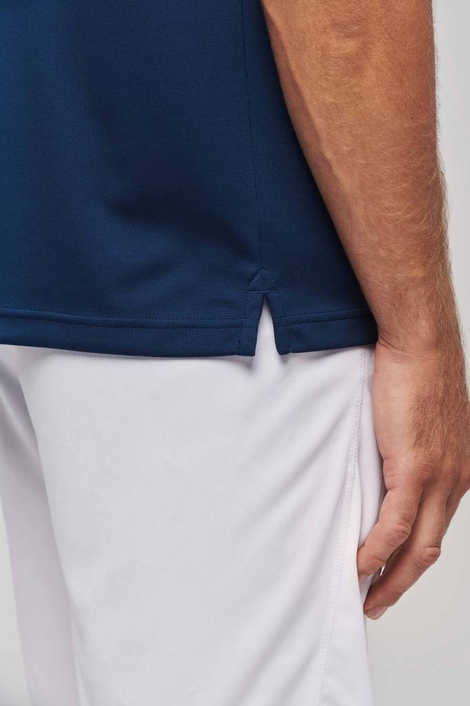 100% polyester. Interlock. Sneldrogende stof. Contrasterend inzetstuk borst. Kraag in ribboord met nektape aan de binnenkant. Ton-sur-ton lijst met 3 knopen. Zijsplitten. Dubbel stiksel aan mouwuiteinden en onderkant.