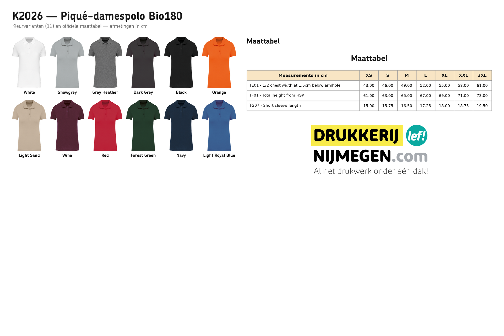 Polo bedrukken Nijmegen? Kariban K2026 Piqué-damespolo Bio180. 100% biologisch gekamd katoen (180 g/m²), piquétricot. GOTS, OEKO-TEX® & PETA Vegan gecertificeerd. 12 kleuren, maten XS t/m 3XL. Ideaal als bedrijfskleding met logo.