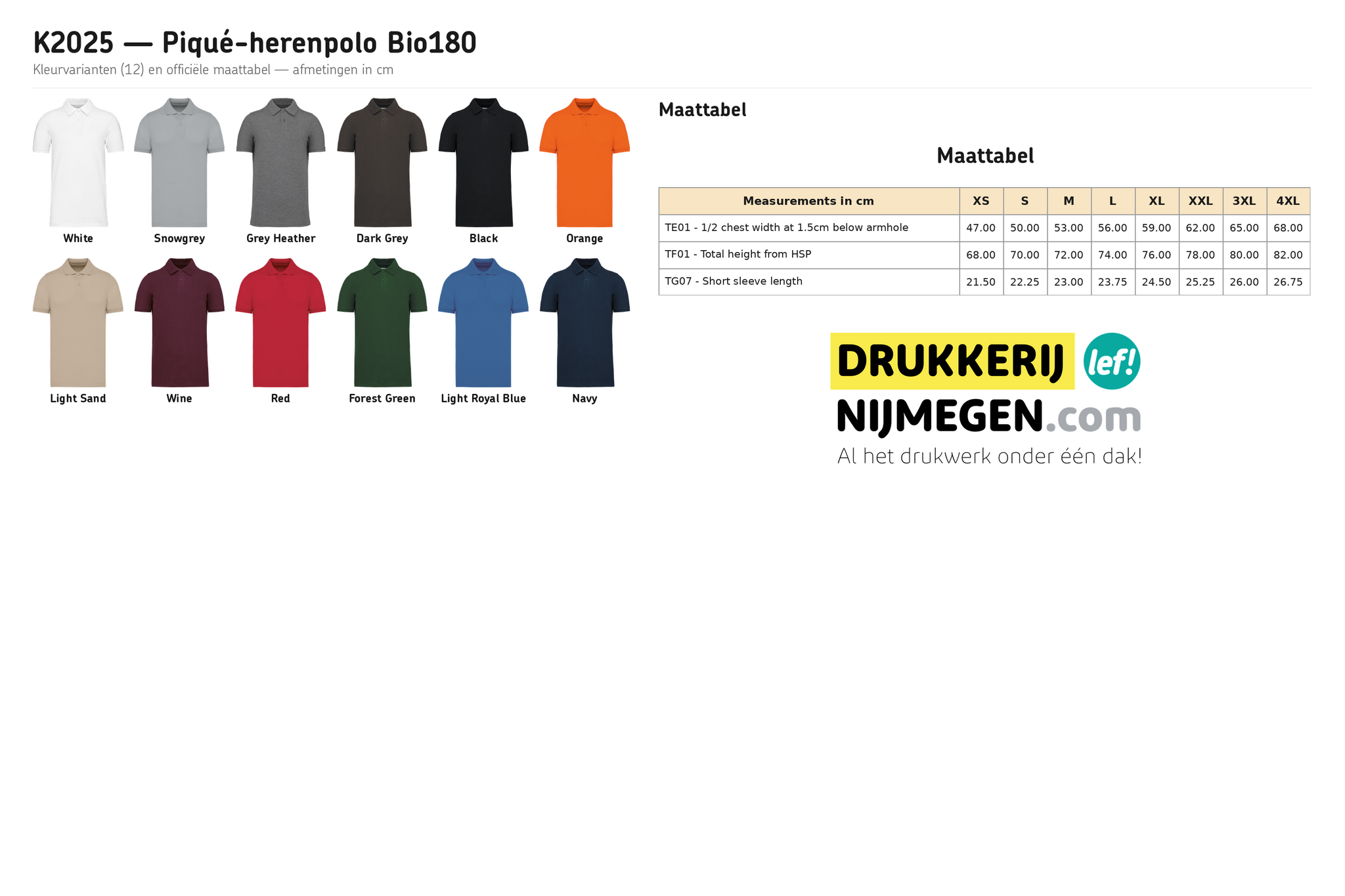 Deze duurzame polo is perfect voor bedrijfskleding met logo. Het biologisch katoenen piqué-oppervlak biedt een uitstekend drukvlak voor een professionele en milieubewuste uitstraling. Ideaal als werkkleding, representatieve kleding of horecakleding. Laat uw polo's bedrukken bij Kwestievanlef Textieldrukkerij in Nijmegen — ook in kleine oplages vanaf 1 stuk. Neem gerust contact op voor een vrijblijvende offerte.