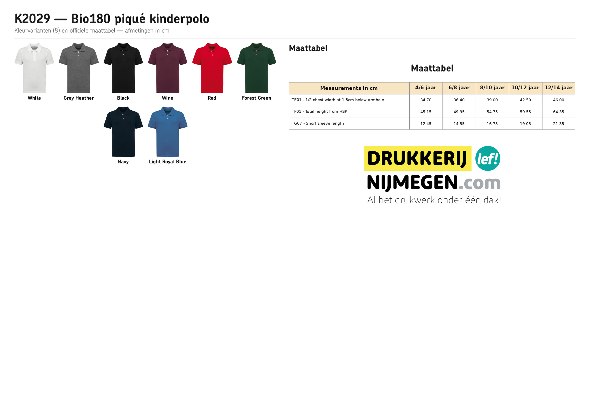 Deze kinderpolo is bij uitstek geschikt om te bedrukken met uw eigen logo of ontwerp. Het gladde piqué-oppervlak zorgt voor een scherpe en heldere print. Ideaal als schoolkleding, teamkleding of evenementenkleding voor kinderen. Bij Kwestievanlef Textieldrukkerij in Nijmegen bedrukken wij uw textiel vakkundig — ook vanaf 1 stuk. Neem gerust contact op voor een vrijblijvende offerte.
