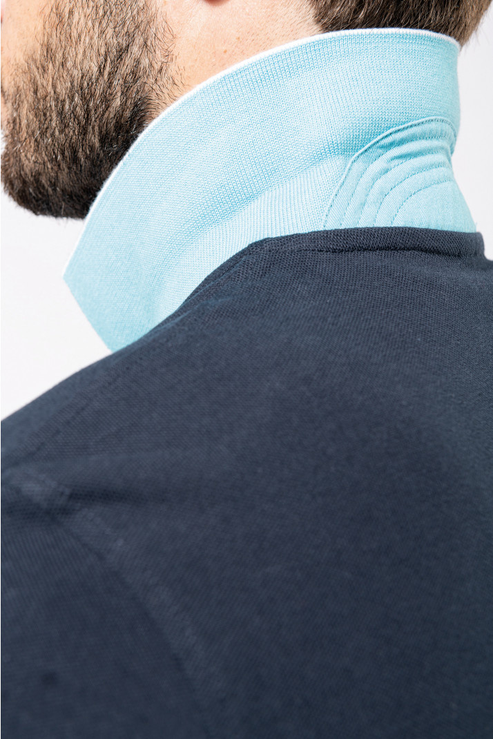 100% katoen piqué. Kraag in rib met bies in contrastkleur aan de boven- en onderkant (behalve White geen contrast onder de kraag). Nektape en zijsplitjes in contrastkleur. Fantasie knooplijst met 2 knopen. Mouwuiteinden in rib met bies in contrastkleur. Afwerking met dubbele stiksels aan de onderkant. De kraag is verstevigd aan de achterkant en kan omhoog of omlaag gedragen worden.