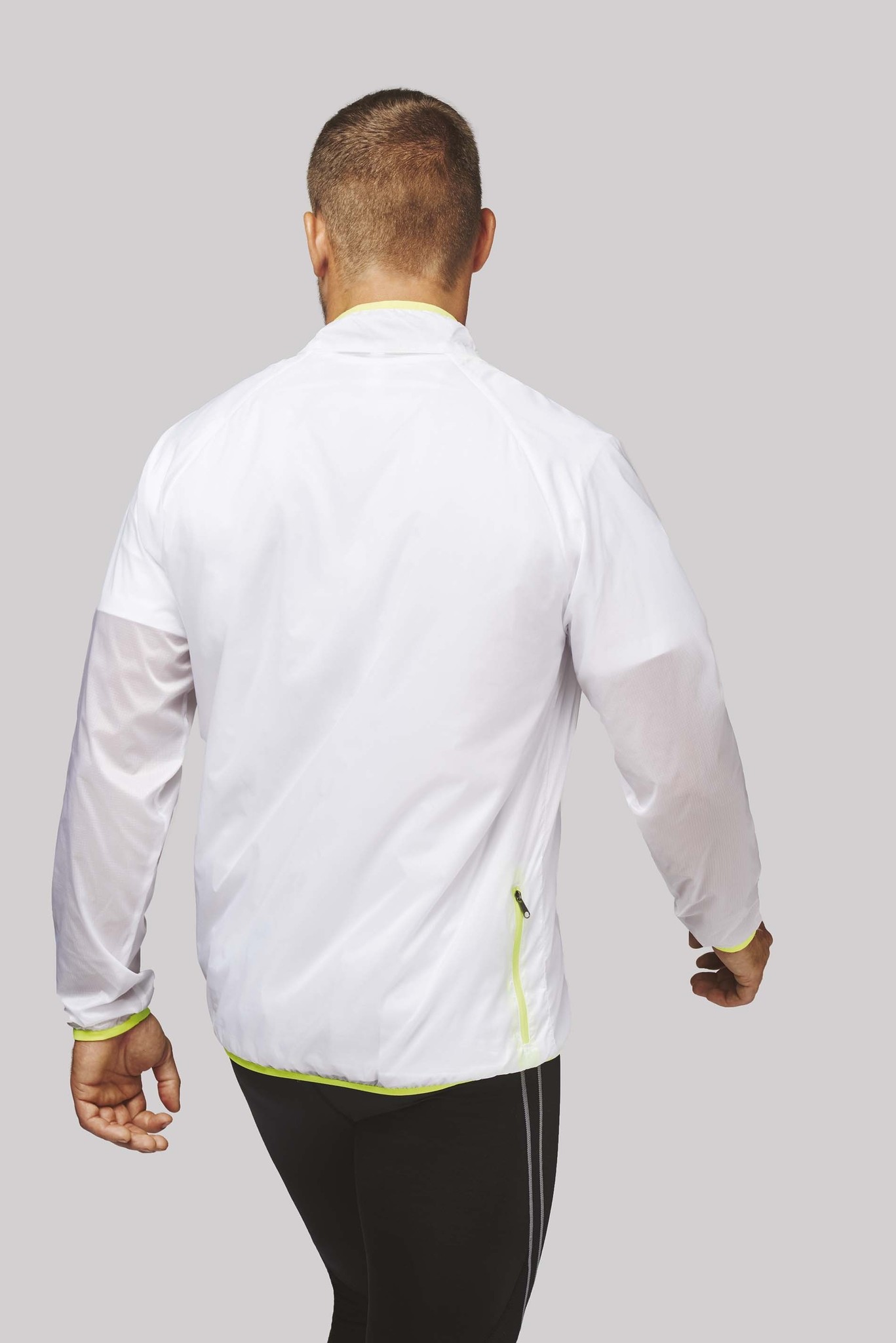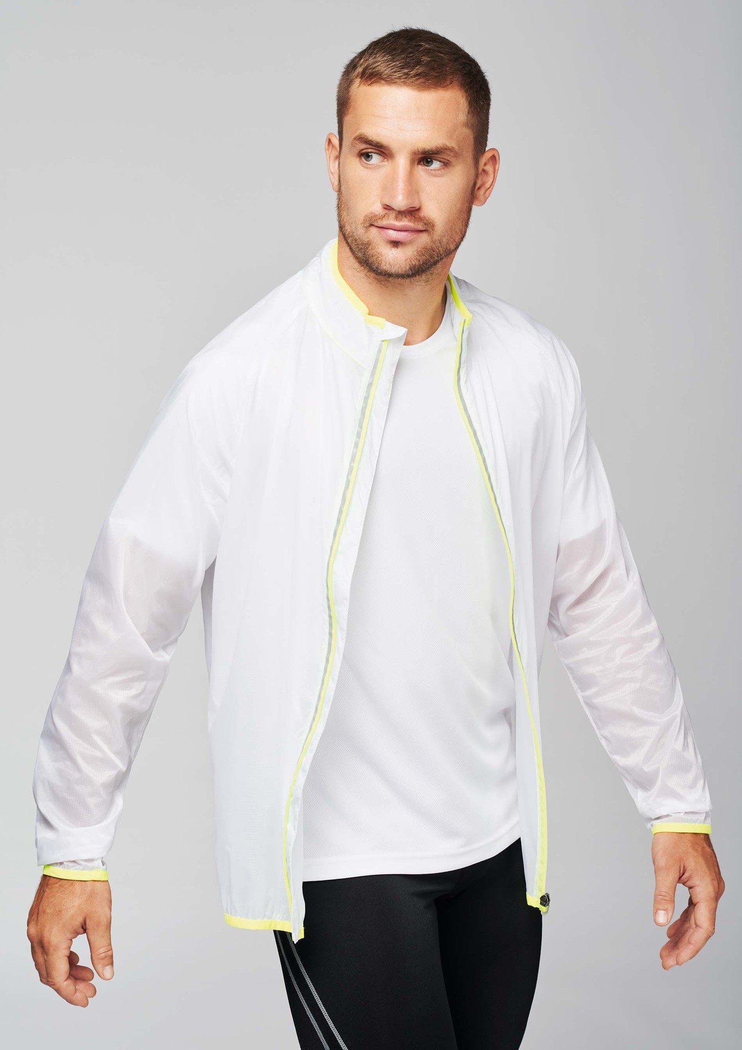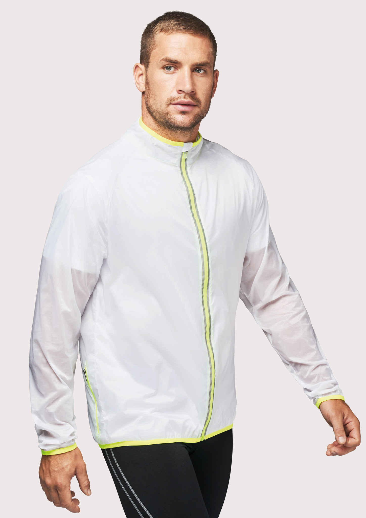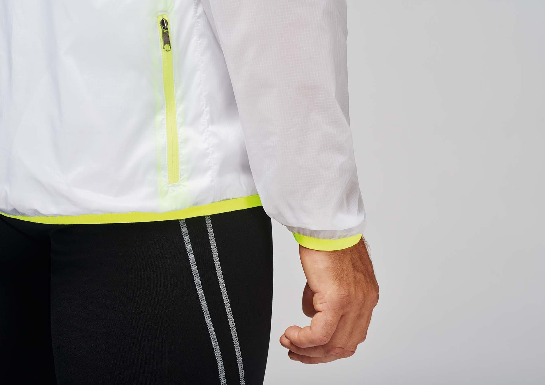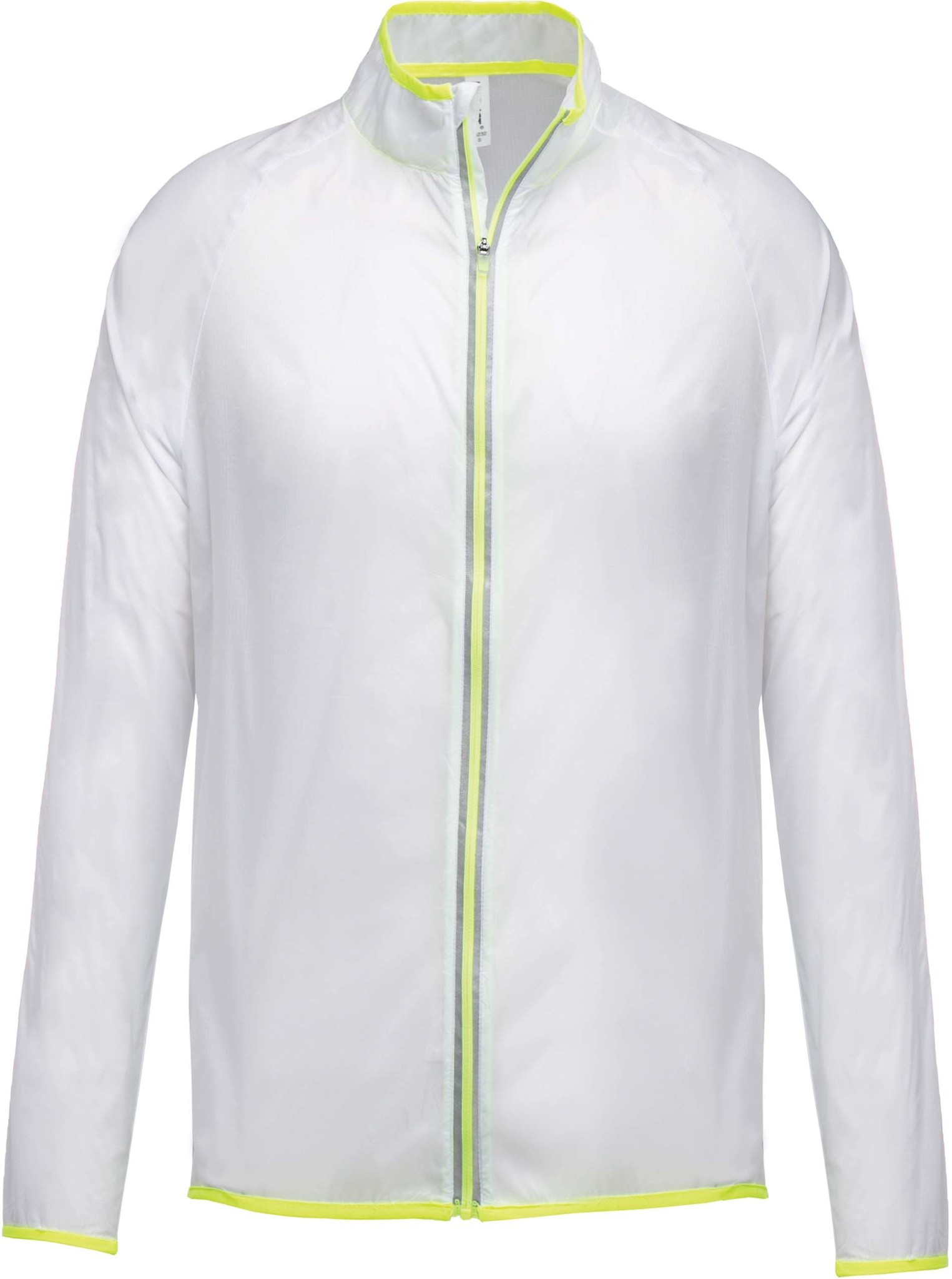 100% ripstop polyamide. Lichte en sneldrogende stof. Raglanmouwen. Fluorescerende elastische bies aan hals, mouwuiteinden en onderkant. Ritssluiting vooraan met reflecterende strook. 1 ritszak aan de zijkant om de jas in op te vouwen (systeem K-way®, met ophanghaak)