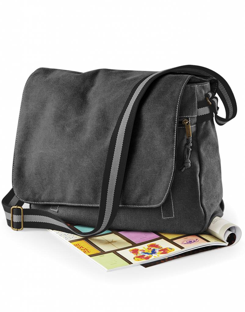 Rip-Strip™ klittenbandsluiting antieke bronskleurige klemmen verstelbare schouderband gemaakt van jacquard materiaal hoofdcompartiment met ritssluiting compartimenten op achterzijde verstevigde onderkant