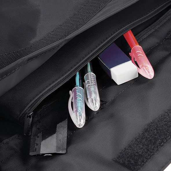 100% Polyester (420D) verstevigd handvat klep met klittenbandsluiting, 2 vakken met ritssluiting boven op klep een vak voor naamlabel reflecterende veiligheidsdriehoek op de voorzijde Inhoud: 7 Liter Afmeting: 37 x 30 x 6 cm.